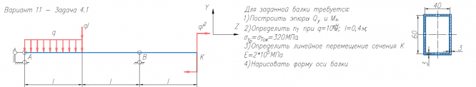 Для заданной балки требуется: 1)Построить эпюры Q/y и M/x. 2)Определить n/Т при q=10кН/м; l=0,4м; σ/Тр=σ/Тсж=320МПа. 3)Определить линейное перемещение сечения К E=2*105/МПа 4)Нарисовать форму оси балки .