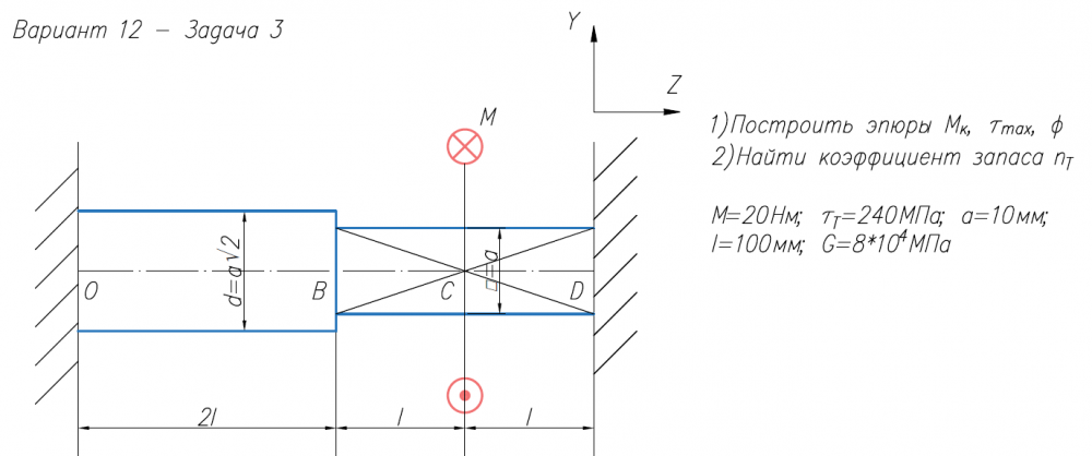 1)Построить эпюры М/к, τ/max, φ 2)Найти коэффициент запаса n/Т М=20Нм; τ/Т=240МПа; a=10мм; l=100мм; G=8*104/МПа.