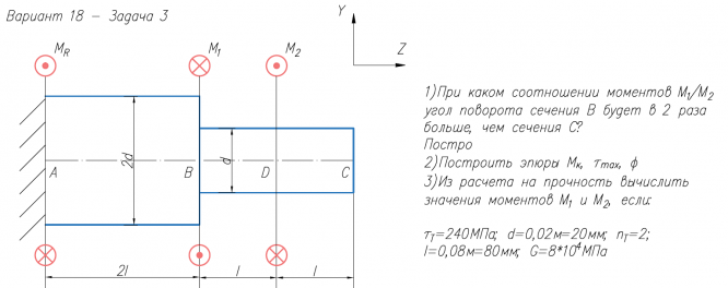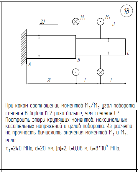 1)При каком соотношении моментов M/1/M/2 угол поворота сечения В будет в 2 раза больше, чем сечения С? Постро 2)Построить эпюры М/к, τ/max, φ 3)Из расчета на прочность вычислить значения моментов M/1 и M/2, если: τ/Т=240МПа; d=0,02м=20мм; n/Т=2; l=0,08м=80мм; G=8*104/МПа .