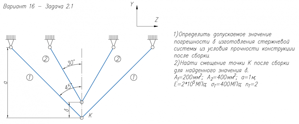 1)Определить допускаемое значение погрешности δ изготовления стержневой системы из условия прочности конструкции после сборки. 2)Найти смещение точки К после сборки для найденного значения δ. A/1=200мм2/; A/2=400мм2/; a=1м; E=2*105/МПа; σ/Т=400МПа; n/Т=2 .