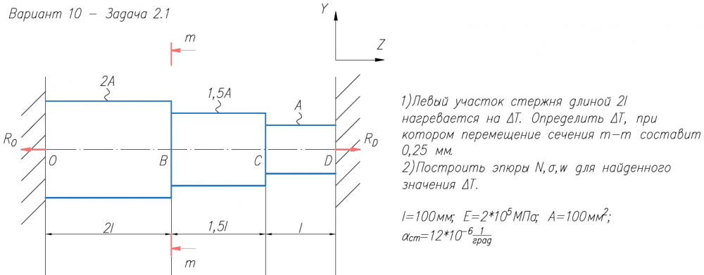 1)Левый участок стержня длиной 2l нагревается на ΔT. Определить ΔT, при котором перемещение сечения m-m составит 0,25 мм. 2)Построить эпюры N,σ,w для найденного значения ΔT. l=100мм; E=2*105/МПа; A=100мм2/; α/ст=12*10-6/1/град.