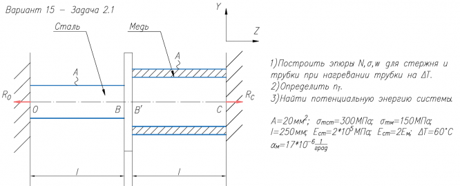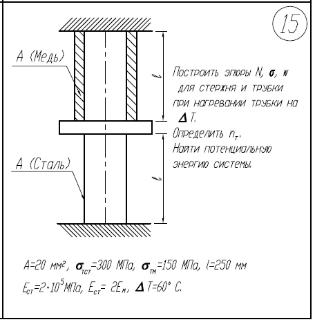 1)Построить эпюры N,σ,w для стержня и трубки при нагревании трубки на ΔT. 2)Определить n/Т. 3)Найти потенциальную энергию системы. A=20мм2/; σ/тст=300МПа; σ/тм=150МПа; l=250мм; E/ст=2*105/МПа; E/ст=2E/м; ΔT=60°С α/м=17*10-6/1/град .