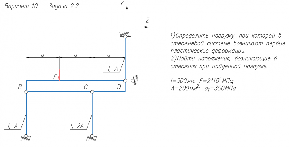 1)Определить нагрузку, при которой в стержневой системе возникают первые пластические деформации. 2)Найти напряжения, возникающие в стержнях при найденной нагрузке. l=300мм; E=2*105/МПа; A=200мм2/; σ/Т=300МПа .