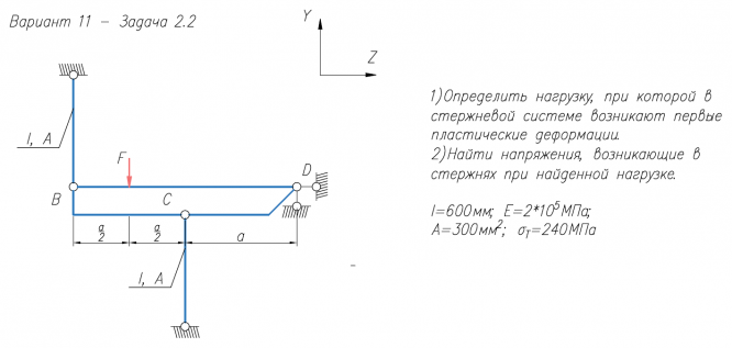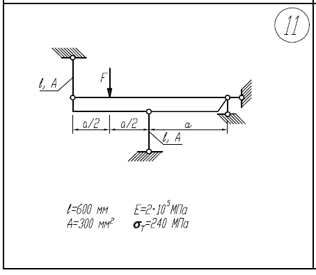 1)Определить нагрузку, при которой в стержневой системе возникают первые пластические деформации. 2)Найти напряжения, возникающие в стержнях при найденной нагрузке. l=600мм; E=2*105/МПа; A=300мм2/; σ/Т=240МПа .
