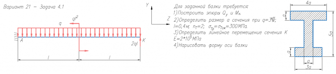 Для заданной балки требуется: 1)Построить эпюры Q/y и M/x. 2)Определить размер а сечения при q=3кН/м; l=0,4м; n/Т=2; σ/Тр=σ/Тсж=300МПа. 3)Определить линейное перемещение сечения К E=2*105/МПа 4)Нарисовать форму оси балки .