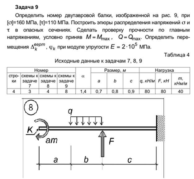 Задача 9: Прямой поперечный изгиб. Подбор сечения балки. Опредление перемещений вариант 4