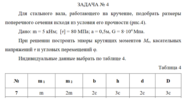 Задача 4: Для стального вала, работающего на кручение, подобрать размеры поперечного сечения исходя из условия его прочности