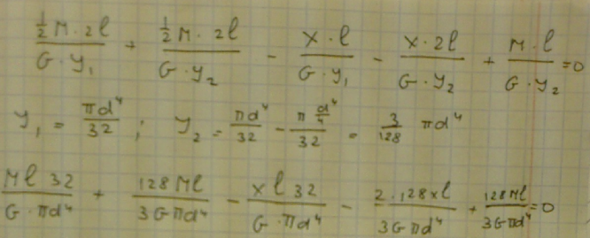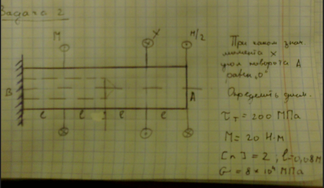 При каком значении момента X угол поворотного сечения A равен нулю? Для найденного значения X построить эпюры крутящих моментов, максимальных касательных напряжений и углов поворота. Определить диаметр вала, если: τT =200 МПа, М=20 Нм, [n]=2, l=0,08 м, G=8*10 4 МПа .