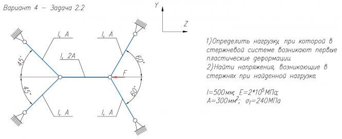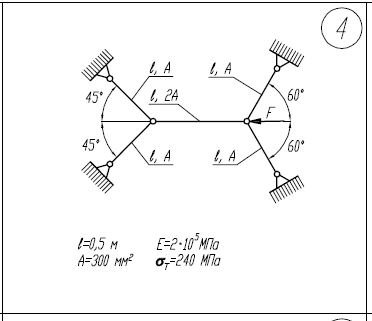 1)Определить нагрузку, при которой в стержневой системе возникают первые пластические деформации. 2)Найти напряжения, возникающие в стержнях при найденной нагрузке. l=500мм; E=2*105/МПа; A=300мм2/; σ/Т=240МПа .