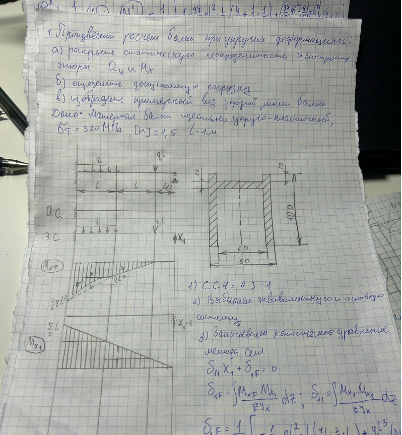 Произвести расчет балки при упругих деформацияха) Раскрыть статическую неопределимость и построить эпюры Qy и Mx