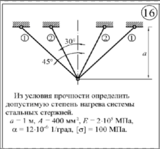 Задача: Для заданной стержневой системы из условия прочности определить температуру, на которую следует нагреть конструкцию.