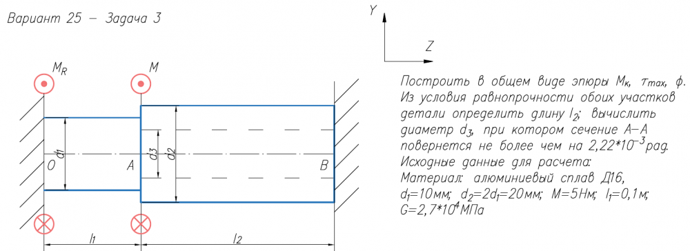Построить в общем виде эпюры М/к, τ/max, φ. Из условия равнопрочности обоих участков детали определить длину l/2; вычислить диаметр d/3, при котором сечение А-А повернется не более чем на 2,22*10-3/рад. Исходные данные для расчета: Материал: алюминиевый сплав Д16, d/1=10мм; d/2=2d/1=20мм; M=5Нм; l/1=0,1м; G=2,7*104/МПа .
