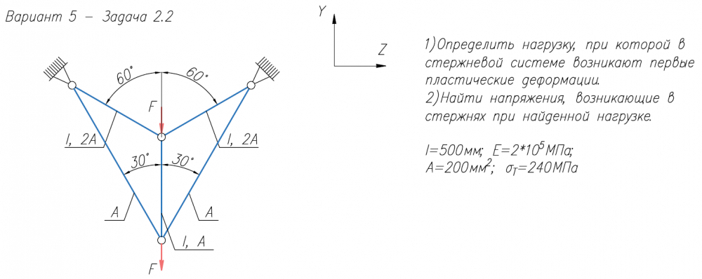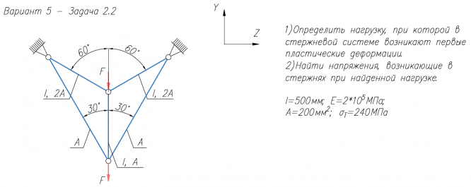 1)Определить нагрузку, при которой в стержневой системе возникают первые пластические деформации. 2)Найти напряжения, возникающие в стержнях при найденной нагрузке. l=500мм; E=2*105/МПа; A=200мм2/; σ/Т=240МПа .