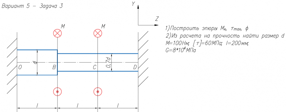 1)Построить эпюры М/к, τ/max, φ 2)Из расчета на прочность найти размер d М=100Нм; [τ]=60МПа; l=200мм; G=8*104/МПа .