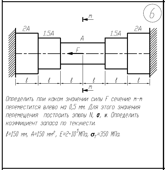 1)Определить при каком значении силы F сечение m-m переместиться влево на 0,5 мм. 2)Для этого значения перемещения построить эпюры N,σ,w. 3)Определить коэффициент запаса по текучести. l=150мм; A=150мм2/; E=2*105/МПа; σ/Т=350МПа.