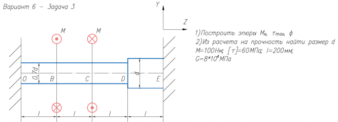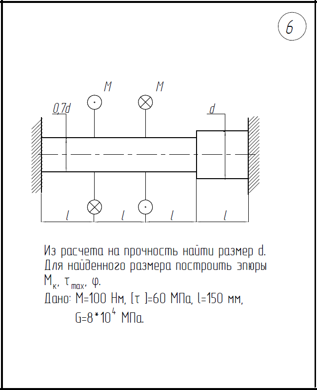 1)Построить эпюры М/к, τ/max, φ 2)Из расчета на прочность найти размер d М=100Нм; [τ]=60МПа; l=200мм; G=8*104/МПа .