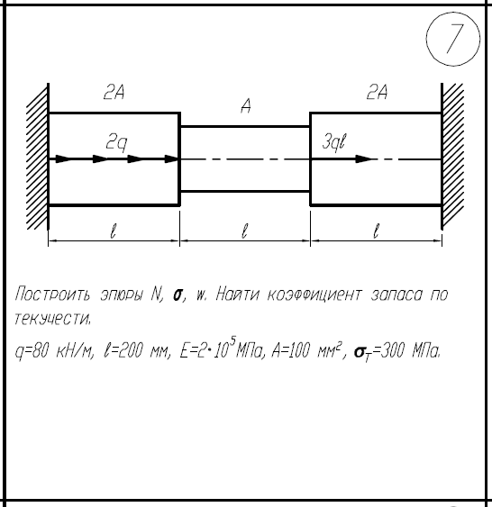 1)Построить эпюры N,σ,w. 2)Найти коэффициент запаса по текучести. q=80кН/м; l=200мм; E=2*105/МПа; A=100мм2/; σ/Т=300МПа.