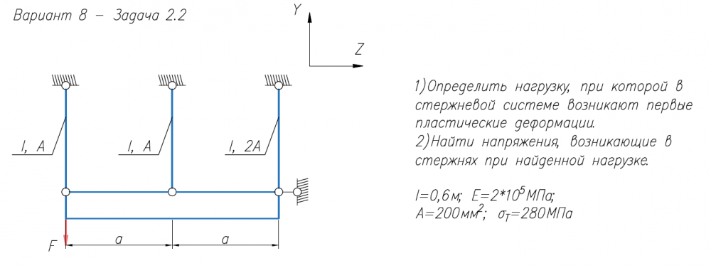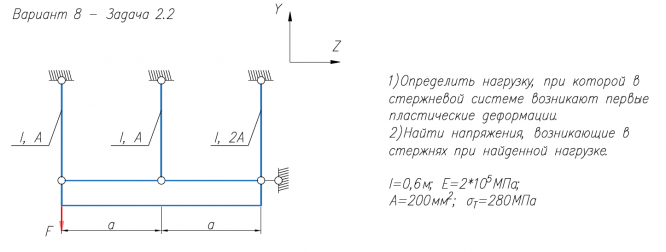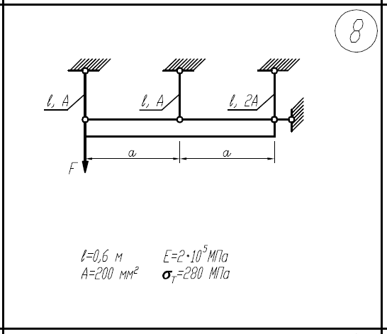 1)Определить нагрузку, при которой в стержневой системе возникают первые пластические деформации. 2)Найти напряжения, возникающие в стержнях при найденной нагрузке. l=0,6м; E=2*105/МПа; A=200мм2/; σ/Т=280МПа .