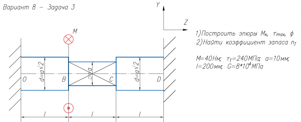 1)Построить эпюры М/к, τ/max, φ 2)Найти коэффициент запаса n/Т М=40Нм; τ/Т=240МПа; a=10мм; l=200мм; G=8*104/МПа.