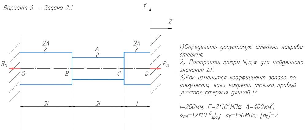 1)Определить допустимую степень нагрева стержня. 2) Построить эпюры N,σ,w для найденного значения ΔT. 3)Как изменится коэффициент запаса по текучести, если нагреть только правый участок стержня длиной l? l=200мм; E=2*105/МПа; A=400мм2/; α/ст=12*10-6/1/град; σ/Т=150МПа; [n/Т]=2 .