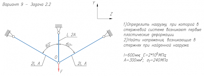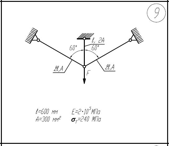 1)Определить нагрузку, при которой в стержневой системе возникают первые пластические деформации. 2)Найти напряжения, возникающие в стержнях при найденной нагрузке. l=600мм; E=2*105/МПа; A=300мм2/; σ/Т=240МПа .