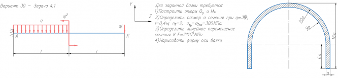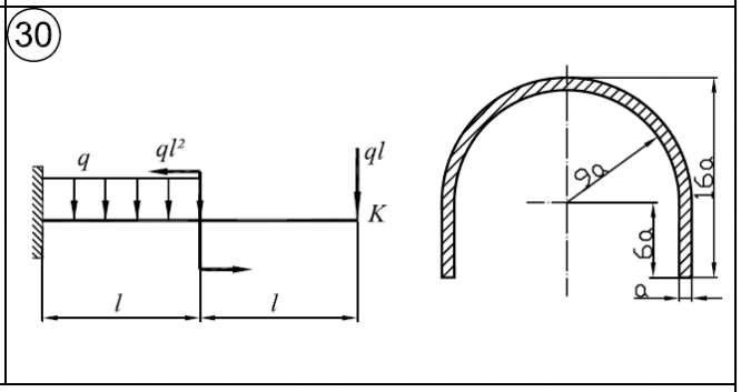 Для заданной балки требуется: 1)Построить эпюры Q/y и M/x. 2)Определить размер а сечения при q=3кН/м; l=0,4м; n/Т=2; σ/Тр=σ/Тсж=300МПа. 3)Определить линейное перемещение сечения К E=2*105/МПа 4)Нарисовать форму оси балки .