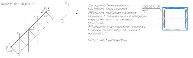 Для заданной балки требуется: 1)Построить эпюру моментов 2)Вычислить наибольшее нормальное напряжение в опасном сечении и определить коэффициент запаса по текучести (σ/Т=240МПа) 3)Построить эпюру нормальных напряжений в опасном сечении, изобразив сечение в масштабе 1:1.
