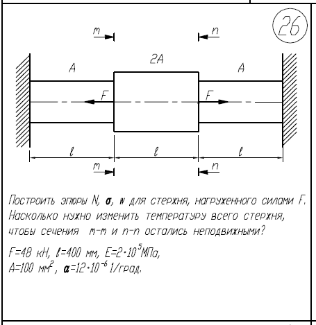 1)Построить эпюры N,σ,w для стержня, нагруженного силами F. 2)На сколько нужно изменить температуру всего стержня, чтобы сечения m-m и n-n остались неподвижными? F=48кН; l=400мм; E=2*105/МПа; A=100мм2/; α=12*10-6/1/град .