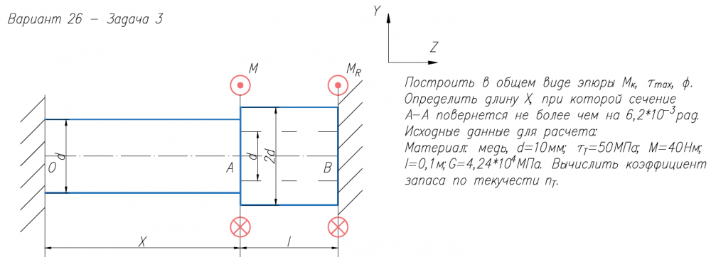 Построить в общем виде эпюры М/к, τ/max, φ. Определить длину Х, при которой сечение А-А повернется не более чем на 6,2*10-3/рад. Исходные данные для расчета: Материал: медь, d=10мм; τ/Т=50МПа; M=40Нм; l=0,1м;G=4,24*104/МПа. Вычислить коэффициент запаса по текучести n/Т..