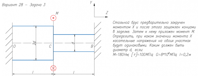Стальной брус предварительно закручен моментом Х и после этого защемлен концами в заделке. Затем к нему приложен момент М. Определить, при каком значении момента Х касательные напряжения на обоих участках будут одинаковыми. Каким должен быть диаметр d, если: М=180Нм; [τ]=100МПа; G=8*104/МПа; l=0,2м.