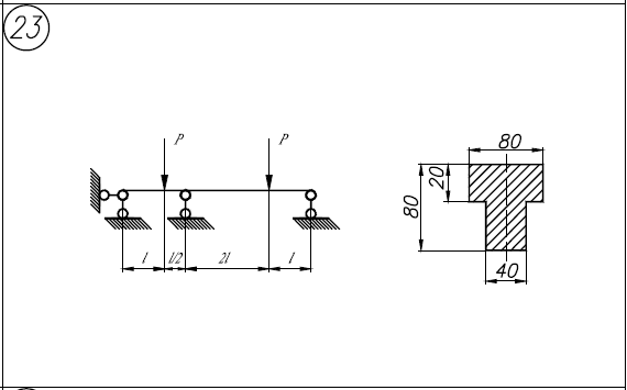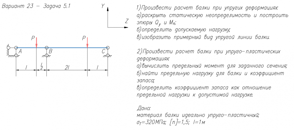 1)Произвести расчет балки при упругих деформациях: а)раскрыть статическую неопределимость и построить эпюры Q/y и M/x; б)определить допускаемую нагрузку; в)изобразить примерный вид упругой линии балки. 2)Произвести расчет балки при упруго-пластических деформациях: а)вычислить предельный момент для заданного сечения; б)найти предельную нагрузку для балки и коэффициент запаса; в)определить коэффициент запаса как отношение предельной нагрузки к допустимой нагрузке. Дано: материал балки идеально упруго-пластичный; σ/Т=320МПа; [n]=1,5; l=1м.