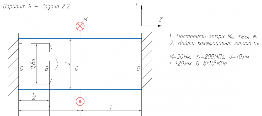 1. Построить эпюры М/к, τ/max, φ 2. Найти коэффициент запаса n/Т М=20Нм; τ/Т=200МПа; d=10мм; l=120мм; G=8*104/МПа .