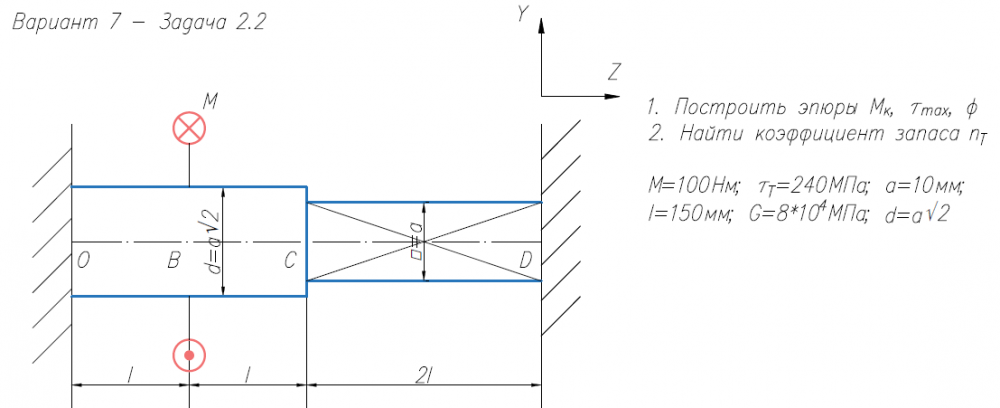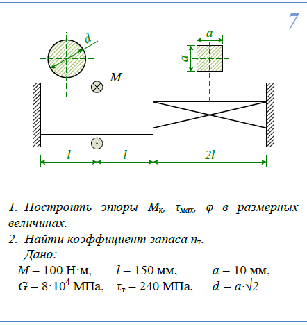 1. Построить эпюры М/к, τ/max, φ 2. Найти коэффициент запаса n/Т М=100Нм; τ/Т=240МПа; a=10мм; l=150мм; G=8*104/МПа; d=a√2.