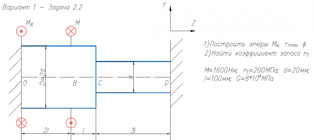 1)Построить эпюры М/к, τ/max, φ 2)Найти коэффициент запаса n/Т М=1600Нм; τ/Т=200МПа; d=20мм; l=100мм; G=8*104/МПа.