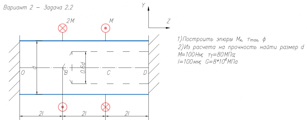 1)Построить эпюры М/к, τ/max, φ 2)Из расчета на прочность найти размер d М=100Нм; τ/Т=80МПа; l=100мм; G=8*104/МПа.