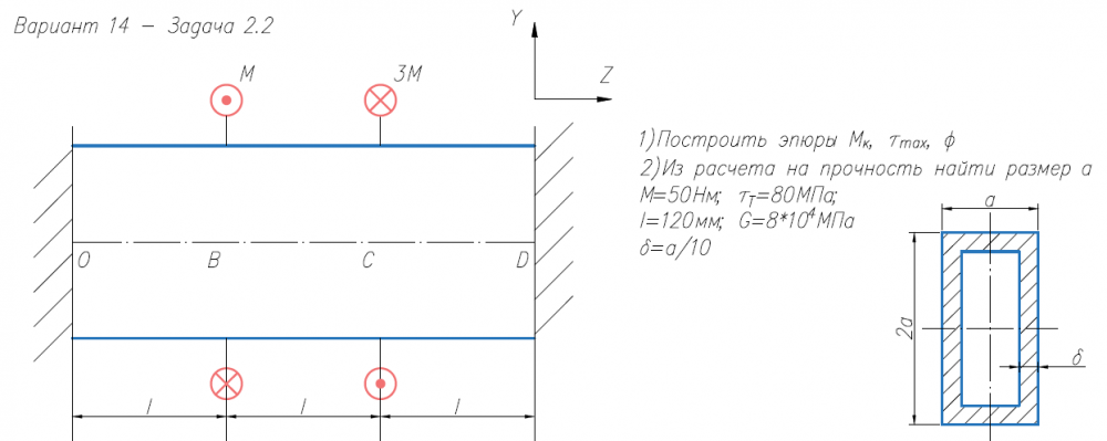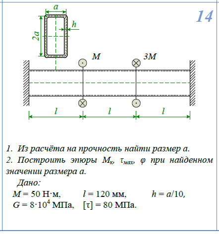 1)Построить эпюры М/к, τ/max, φ 2)Из расчета на прочность найти размер a М=50Нм; τ/Т=80МПа; l=120мм; G=8*104/МПа δ=a/10 .
