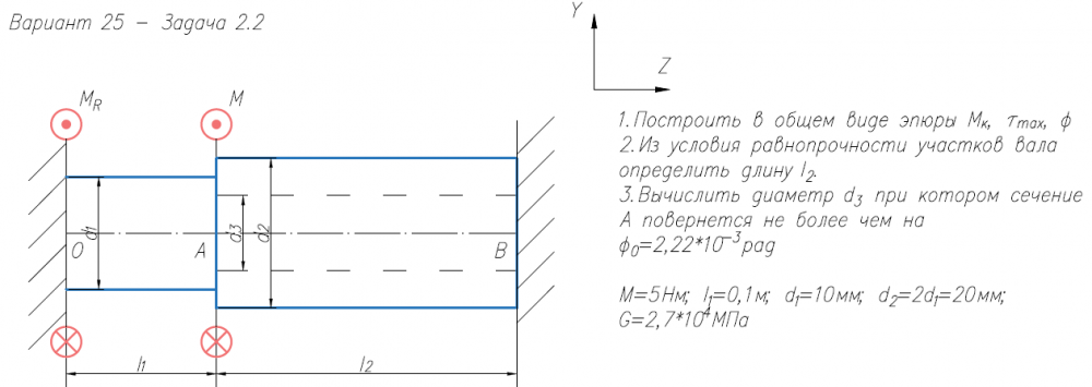 1.Построить в общем виде эпюры М/к, τ/max, φ 2.Из условия равнопрочности участков вала определить длину l/2. 3.Вычислить диаметр d/3 при котором сечение А повернется не более чем на φ/0=2,22*10-3/рад M=5Нм; l/1=0,1м; d/1=10мм; d/2=2d/1=20мм; G=2,7*104/МПа.
