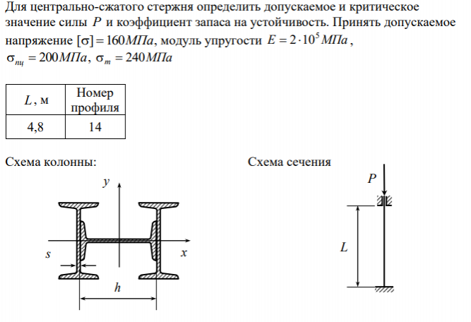Для центрально-сжатого стержня определить допускаемое и критическое значение силы P и коэффициент запаса на устойчивость. Принять допускаемое напряжение [] 160МПа, модуль упругости E