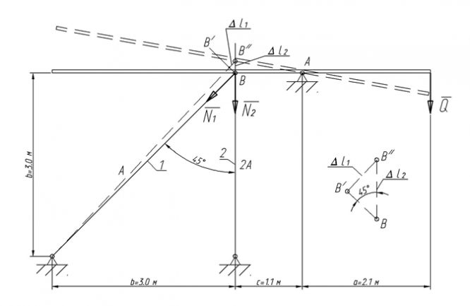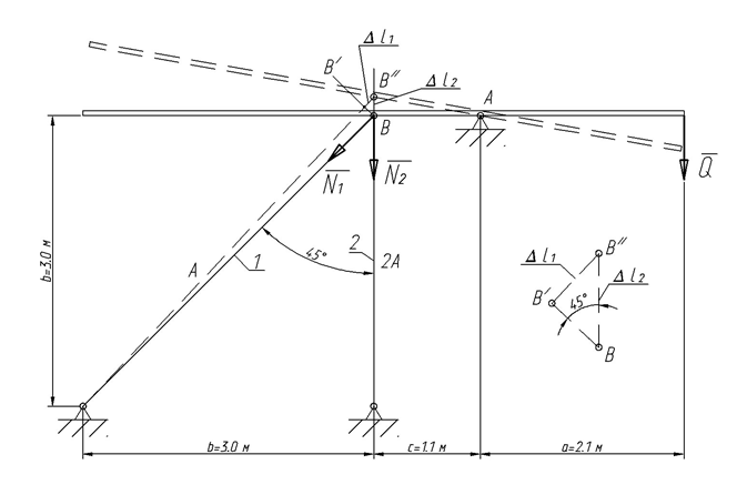 a=2.1 м; b=3.0 м; с=1.1 м; A=12×10-4 м2; Е=2×1011 Па; ; ; k=1.5.