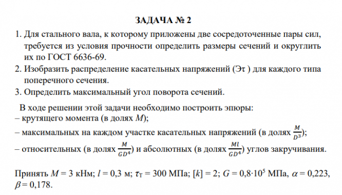 1. Для стального вала, к которому приложены две сосредоточенные пары сил, требуется из условия прочности определить размеры сечений и округлить их по ГОСТ 6636-69. 2. Изобразить распределение касательных напряжений (Эτ ) для каждого типа поперечного сечения. 3. Определить максимальный угол поворота сечений. В ходе решении этой задачи необходимо построить эпюры: – крутящего момента (в долях M); – максимальных на каждом участке касательных напряжений (в долях 𝑀𝑀 𝐷𝐷3); – относительных (в долях 𝑀𝑀 𝐺𝐺𝐷𝐷4) и абсолютных (в долях 𝑀𝑀𝑀𝑀 𝐺𝐺𝐷𝐷4) углов закручивания. Принять M = 3 кНм; l = 0,3 м; τТ = 300 МПа; [k] = 2; G = 0,8∙105 МПа, α = 0,223, β = 0,178.