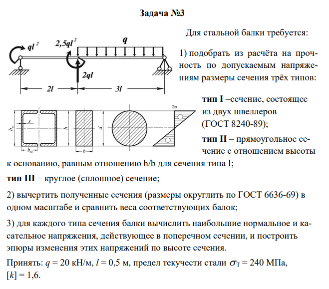 Для стальной балки требуется: 1) подобрать из расчёта на прочность по допускаемым напряжениям размеры сечения трёх типов: тип I –сечение, состоящее из двух швеллеров (ГОСТ 8240-89); тип II – прямоугольное сечение с отношением высоты к основанию, равным отношению h/b для сечения типа I; тип III – круглое (сплошное) сечение; 2) вычертить полученные сечения (размеры округлить по ГОСТ 6636-69) в одном масштабе и сравнить веса соответствующих балок; 3) для каждого типа сечения балки вычислить наибольшие нормальное и касательное напряжения, действующее в поперечном сечении, и построить эпюры изменения этих напряжений по высоте сечения.