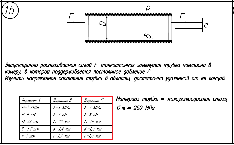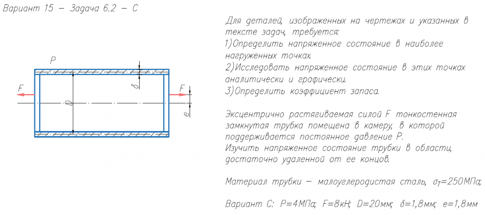 Задача 6.2. Для деталей, изображенных на чертежах и указанных в тексте задач, требуется: 1)Определить напряженное состояние в наиболее нагруженных точках. 2)Исследовать напряженное состояние в этих точках аналитически и графически. 3)Определить коэффициент запаса. Эксцентрично растягиваемая силой F тонкостенная замкнутая трубка помещена в камеру, в которой поддерживается постоянное давление P. Изучить напряженное состояние трубки в области, достаточно удаленной от ее концов. Материал трубки - малоуглеродистая сталь, σ/Т=250МПа; Вариант C: P=4МПа; F=8кН; D=20мм; δ=1,8мм; e=1,8мм.