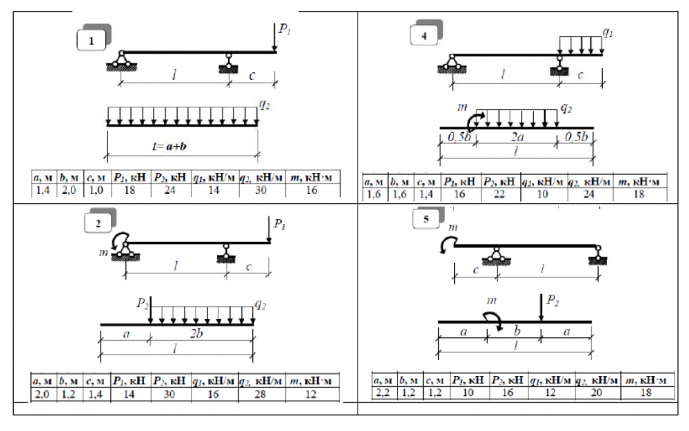 Таблица 3 №, п/п 1 2 3 4 5 6 7 8 9 10 11 12 а, см 5,0 5,5 6,0 6,5 7,0 7,5 8,0 8,5 9,0 9,5 10,0 10,5 точка прилож. силы 1 2 3 4 5 6 2 3 4 5 6 1 Рис.4 Схемы поперечных сечений стержня к задаче №3 Задача № 4 Растяжение-сжатие с изгибом Для консольной балки указанного сечения по схеме № ____ (рис.5) при за-данных значениях геометрических размеров и расчётных значений нагрузок по столбцу № ____ таблицы 4 требуется: • построить эпюры внутренних усилий; • построить эпюру нормальных напряжений в опасном сечении балки и про-верить прочность, приняв R = 210 МПа = 21 кН/см2, γс = 1. Таблица 4 №, п/п 1 2 3 4 5 6 7 8 9 10 11 12 l, м 4,0 3,9 3,8 3,7 3,6 3,5 3,4 3,3 3,2 3,1 3,0 2,9 Р, кН 300 320 340 360 380 400 420 440 460 480 500 520 Р1, кН 16 18 20 22 24 26 28 30 32 34 36 40 q, кН/м 10 10 12 12 14 14 16 18 18 20 24 30 двутавр 18 20 22 24 27 30 33 36 40 45 50 55 швеллер 18 20 22 24 27 27 30 30 36 36 40 40 лист (bxδ), мм 200 ×10 230 ×10 250 ×10 270 ×10 280 ×10 300 ×10 320 ×10 330 ×10 340 ×10 350 ×10 380 ×10 400 ×10 Рис.5 Схемы балок к задаче №4 Задача № 5 Изгиб с кручением Для стального ломаного стержня круглого поперечного сечения по схеме № ____ (рис.6), нагруженного в вертикальной и горизонтальной плоскостях, при заданных значениях геометрических размеров и нормативных значениях нагрузок по столбцу № ____ таблицы 5 требуется: • построить эпюры изгибающих и крутящих моментов; • пользуясь третьей или четвёртой теорией прочности, подобрать сечение по методу допускаемых напряжений, приняв [  ] = 160 МПа.