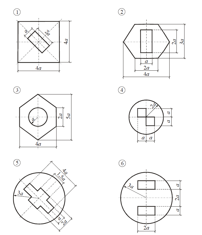 Таблица 2 №, п/п 1 2 3 4 5 6 7 8 9 10 11 12 l, м 2,0 1,9 1,8 1,7 1,6 1,5 1,4 1,3 1,3 1,5 1,4 1,6 а, м 0,8 0,8 0,7 0,7 0,6 0,6 0,5 0,5 0,4 0,4 0,6 0,5 Р, кН 2,0 2,5 3,0 4,0 4,5 5,0 6,0 7,0 8,0 9,0 10 12 q, кН/м 4,0 4,5 5,0 5,5 6,0 7,0 8,0 9,0 10 12 14 16 h/b 1,2 1,3 1,4 1,5 1,6 1,7 1,8 1,7 1,6 1,5 1,4 1,3 Рис.3 Схемы балок к задаче №2 Задача №3 Внецентренное сжатие стержня Для внецентренно сжатого короткого стержня с заданным поперечным се-чением по схеме № _____ (рис.4) с геометрическими размерами и точкой при-ложения силы по столбцу № ____ таблицы 3, требуется: • определить площадь поперечного сечения и положение центра тяжести; • определить моменты и радиусы инерции относительно главных цен-тральных осей; • определить положение нулевой линии; • определить величину наибольшей расчётной сжимающей силы из условий прочности по методу предельных состояний, приняв расчётные сопротив-ления материала при растяжении Rр = 1 МПа = 0,1 кН/см2, при сжатии Rc = 5 МПа = 0,5 кН/см2, коэффициент условий работы γс = 1; • построить эпюру нормальных напряжений в поперечном сечении стержня; • построить ядро сечения.