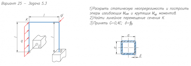 1)Раскрыть статическую неопределимость и построить эпюры изгибающих M/изг и крутящих M/кр моментов. 2)Найти линейное перемещение сечения К. 3)Принять G=0,4E.