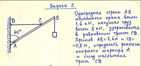 Однородная стрела АВ настенного крана весом 16 кН, несущая груз весом 8 кН, удерживается в равновесии тросом СД.