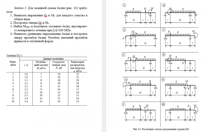 2. Построить эпюры Qz и My. 3. Найти Mмакс и подобрать стальную балку двутаврово-го поперечного сечения при =160 МПа. 4. Написать уравнение перемещения балки и построить эпюру прогибов балки. Расчёты значений прогибов привести в табличной форме. Таблица П1.3. Вари- антыДанные величины l, мИзгибаю-щий момент M, кНмСосредото-ченная сила Р, кНРавномерно распределен-ная нагрузка q, кН/м 1 2 3 4 5 6 7 8 9 101,0 1,0 1,1 1,1 1,2 1,2 1,3 1,3 1,4 1,47 7 8 8 9 9 10 10 11 1120 19 18 16 15 14 13 12 11 1022 21 20 19 18 17 16 15 14 13 .