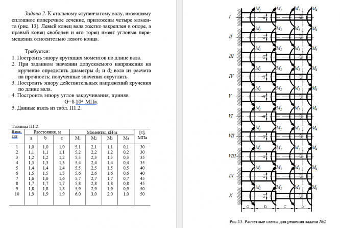 Таблица П1.1. Вели-чинаВарианты 12345678910 А, см2 l, м q, кн/м P1, кН P2, кН4 0,2 10 5 104 0,2 10 5 105 0,2 20 10 205 0,2 20 10 206 0,2 10 20 306 0,2 10 20 307 0,2 20 10 407 0,2 20 10 408 0,2 10 20 508 0,2 10 20 50 Задача 2. К стальному ступенчатому валу, имеюще-му сплошное поперечное сечение, приложены четыре мо-мента (рис. 13). Левый конец вала жестко закреплен в опоре, а правый конец свободен и его торец имеет угло-вые перемещения относительно левого конца. Требуется: 1. Построить эпюру крутящих моментов по длине вала. 2. При заданном значении допускаемого напряжения на кручение определить диаметры d1 и d2 вала из расчета на прочность; полученные значения округлить.