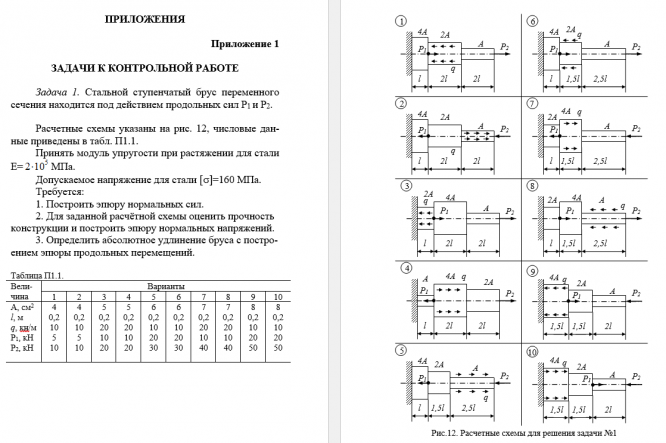 Для лучшего усвоения пройденного материала по-сле изучения каждой темы необходимо ответить на вопро-сы для самопроверки, приведенные в методических указа-ниях. ПРИЛОЖЕНИЯ Приложение 1 ЗАДАЧИ К КОНТРОЛЬНОЙ РАБОТЕ Задача 1. Стальной ступенчатый брус переменного сечения находится под действием продольных сил P1 и Р2. Расчетные схемы указаны на рис. 12, числовые дан-ные приведены в табл. П1.1. Принять модуль упругости при растяжении для ста-ли Е= МПа. Допускаемое напряжение для стали []=160 МПа. Требуется: 1. Построить эпюру нормальных сил. 2. Для заданной расчётной схемы оценить прочность конструкции и построить эпюру нормальных напряжений. 3. Определить абсолютное удлинение бруса с по-строением эпюры продольных перемещений.