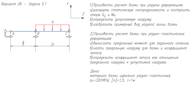 1)Произвести расчет балки при упругих деформациях: а)раскрыть статическую неопределимость и построить эпюры Q/y и M/x; б)определить допускаемую нагрузку; в)изобразить примерный вид упругой линии балки. 2)Произвести расчет балки при упруго-пластических деформациях: а)вычислить предельный момент для заданного сечения; б)найти предельную нагрузку для балки и коэффициент запаса; в)определить коэффициент запаса как отношение предельной нагрузки к допустимой нагрузке. Дано: материал балки идеально упруго-пластичный; σ/Т=320МПа; [n]=1,5; l=1м.